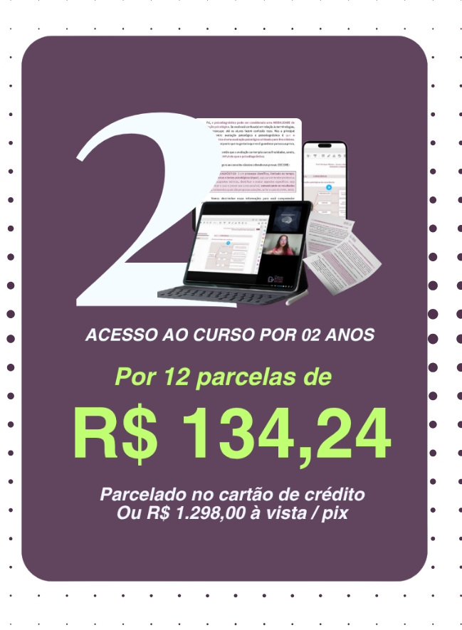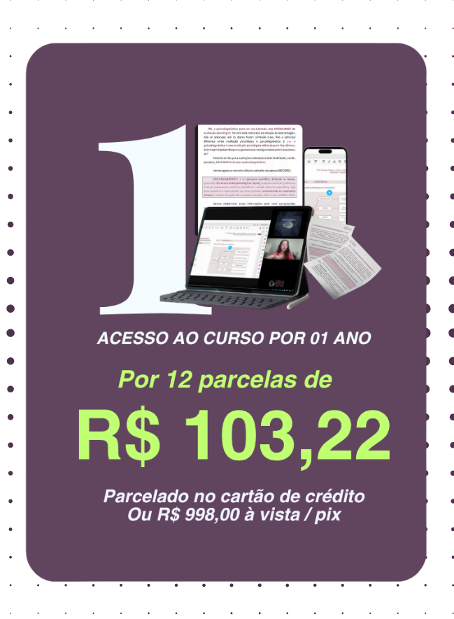 É um curso preparatório de CONHECIMENTOS ESPECÍFICOS para concursos da área de Psicologia, sendo indicado para preparação em certames de níveis Federal, Estadual e/ou Municipal, para Psicólogas e Psicólogos iniciantes ou avançados em estudos para concursos públicos. Abrange material em videoaulas e PDFs e aulas ao vivo de revisão.